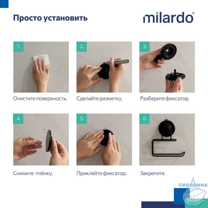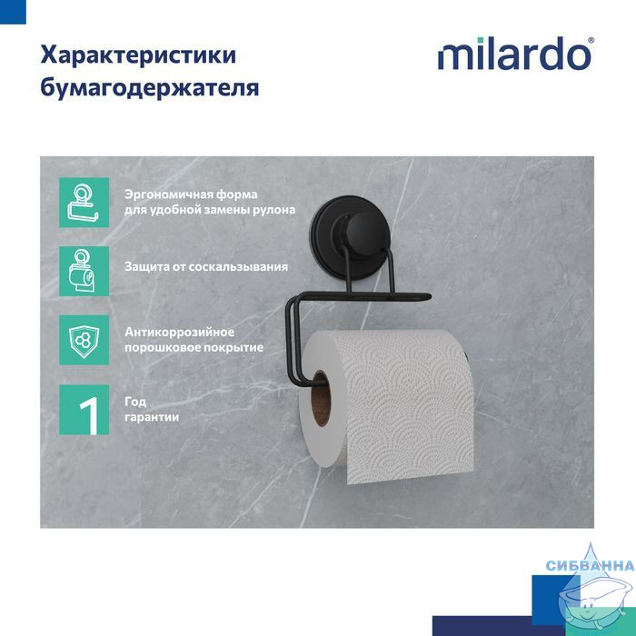 Бумагодержатель Milardo® монтируется специальным фиксатором на клеевой слой, дополнительно усиленный вакуумом, что увеличивает степень соприкосновения клеевой основы с поверхностью стены.