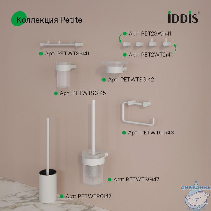 Petite – базовая коллекция функциональных аксессуаров для ванной с минималистичным, спокойным дизайном и округлыми формами, что делает её универсальным украшением любого современного санузла. Аксессуары в универсальном матовом хроме преобразят интерьер, сделают его завершённым и гармоничным. Идеально дополнят смесители IDDIS® из коллекций Aiger по цвету и форме.