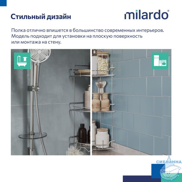 • Полка Milardo® выполнена из антикоррозийной стали с никель-хромовым покрытием, благодаря чему она прослужит дольше во влажном помещении ванной комнаты.