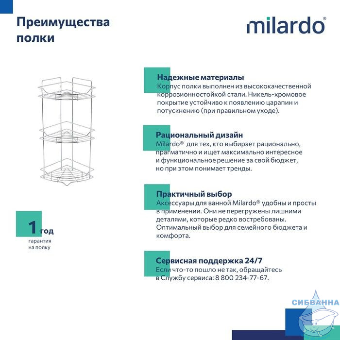 • Гарантия на полку для ванной комнаты Milardo® – 1 год.