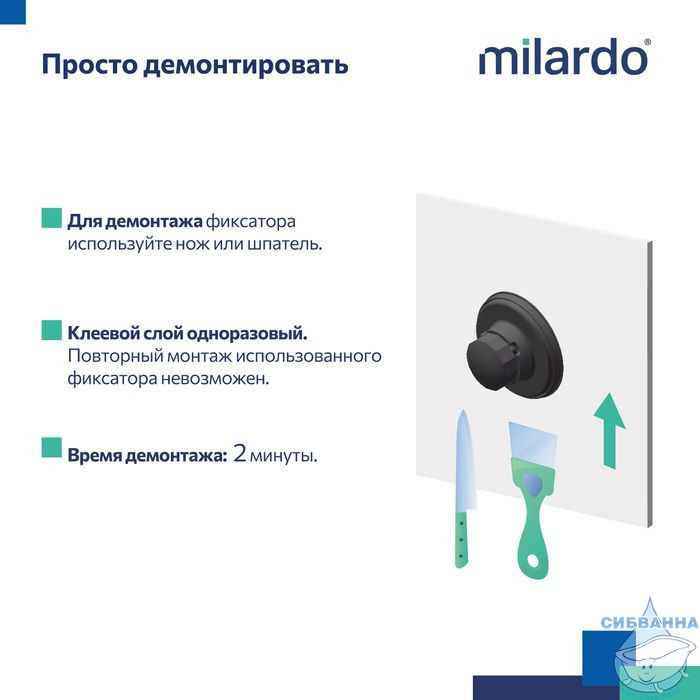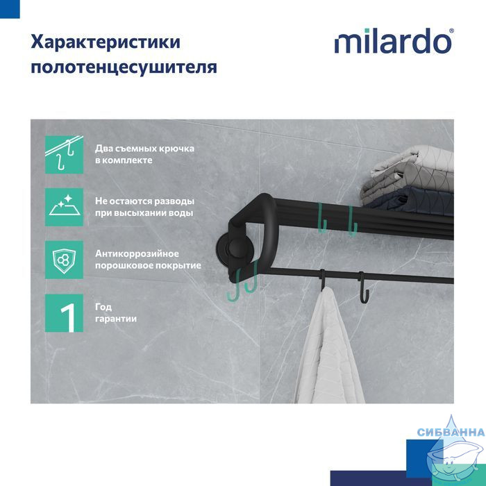 • В отличие от изделий из пластика полотенцесушитель Milardo® может выдерживать высокую (до 7 кг) нагрузку. Он монтируется без сверления, а значит можно не опасаться повредить красивую плитку или другое настенное покрытие.