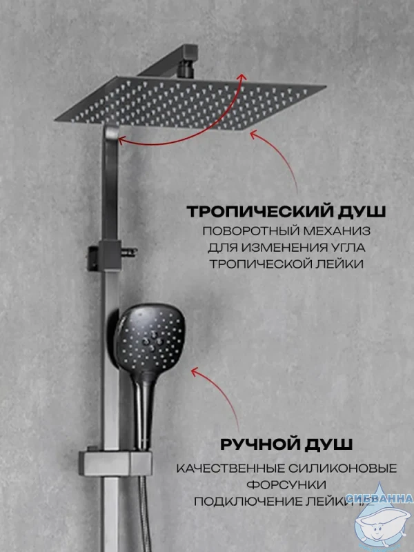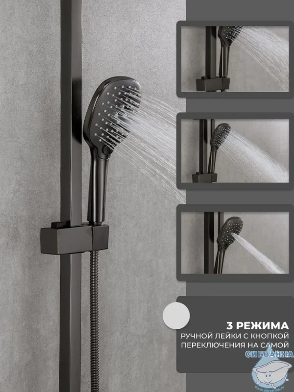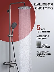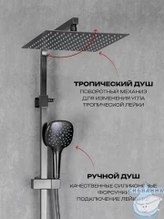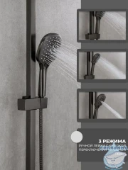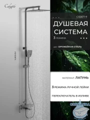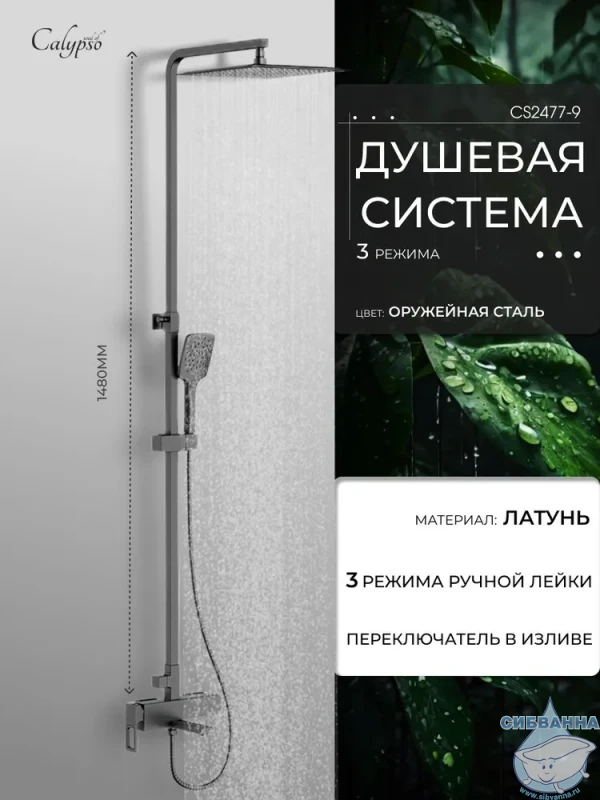 Душевая система Calypso CS2477-9 предназначена для крепления на стену рядом с ванной, в душевой кабине или на стену в душевом уголке. В состав душевого гарнитура входят смеситель, душевая стойка, тропический душ, ручная лейка с душевым шлангом и держателем, а также набор деталей для монтажа. Смеситель оснащен керамическим картриджем Sedal, отличающимся сниженной шумностью работы и большим ресурсом, а также поворотным горизонтальным изливом, который при повороте переключает режимы смесителя и душа и в сложенном состоянии не занимает дополнительного места. Также компактности душевому набору добавляет расположенный с торца смесителя однорычажный механизм настройки температуры и напора воды. Переключатель тропического и ручного душа расположен на регулируемой по высоте душевой стойке, через которую вода поступает в тропический душ размером 30 х 30 см. Ручная лейка имеет три режима работы – стандартный, массажный и комбинированный. Душевая система изготовлена из латуни и окрашена в цвет оружейной стали, что придает ей стильный и строгий вид, подходящий для современных интерьеров ванных комнат. Гарантийный срок обслуживания данного душевого гарнитура составляет 5 лет.