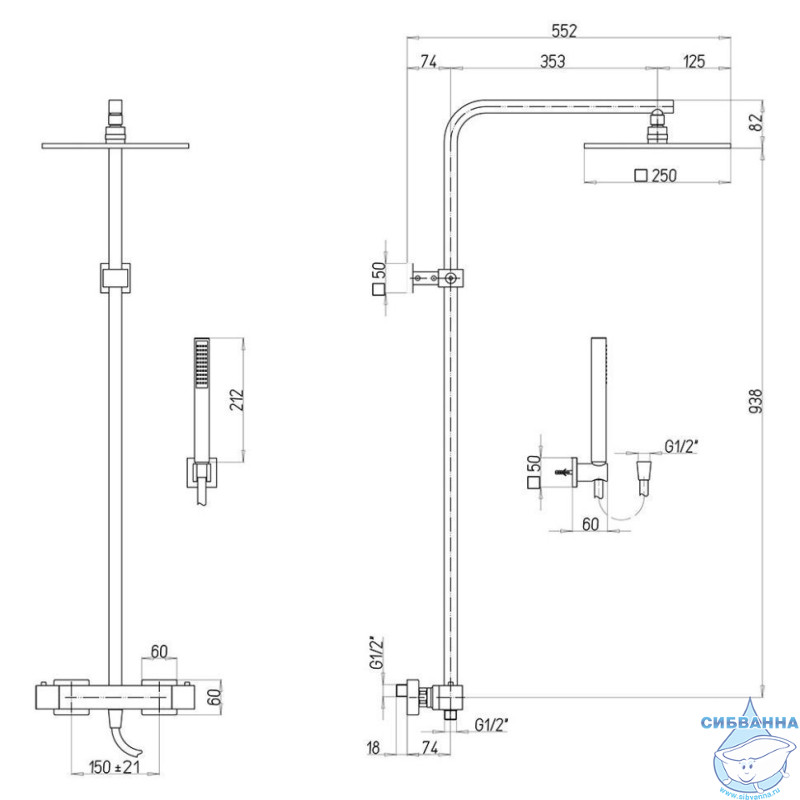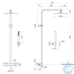 Ширина верхнего рассеивателя – 250 мм, поток воды покрывает все тело.