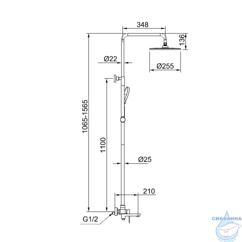 Регулируемая по высоте душевая штанга: 1065-1565 мм.