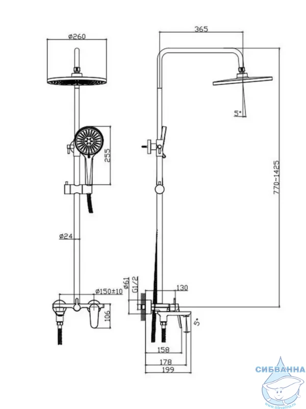 Регулируемая по высоте душевая штанга: 770-1425 мм.