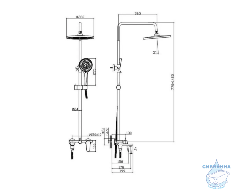 Регулируемая по высоте душевая штанга: 770-1425 мм.