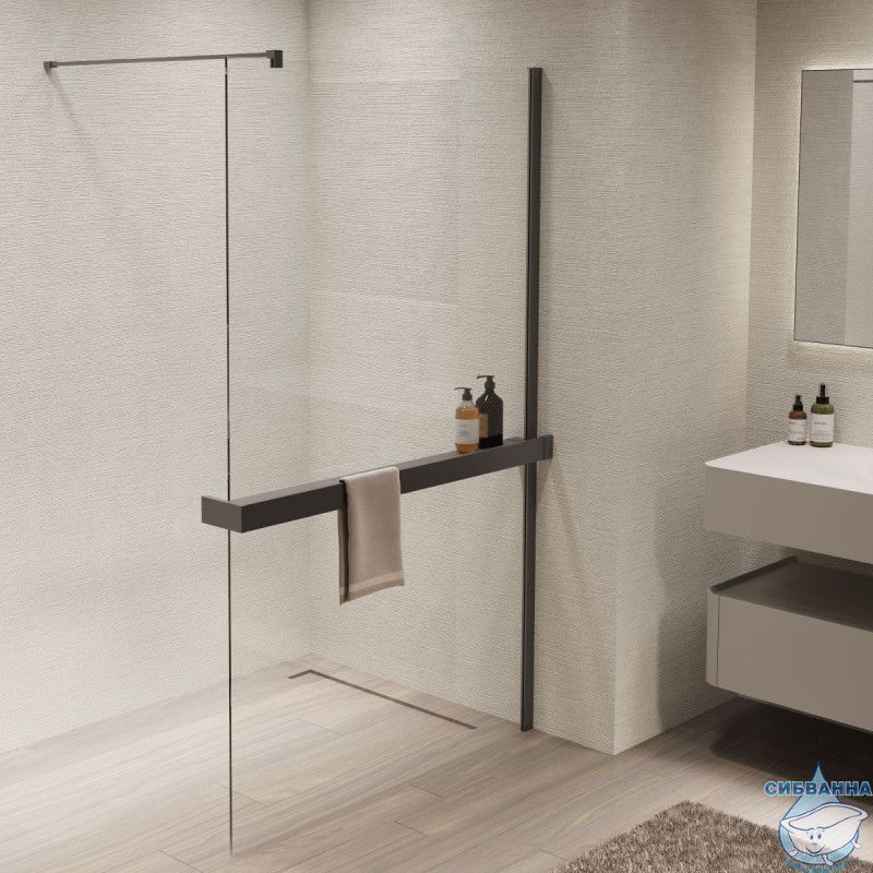 Серия: Walk-In Материал: алюминий Высота, мм: 2000 Толщина стекла: 8мм Душевая перегородка с полкой и полотенцедержателем Максимальная длина держателя кронштейна – 1200мм Длина полки с полотенцедержателем – 1400мм