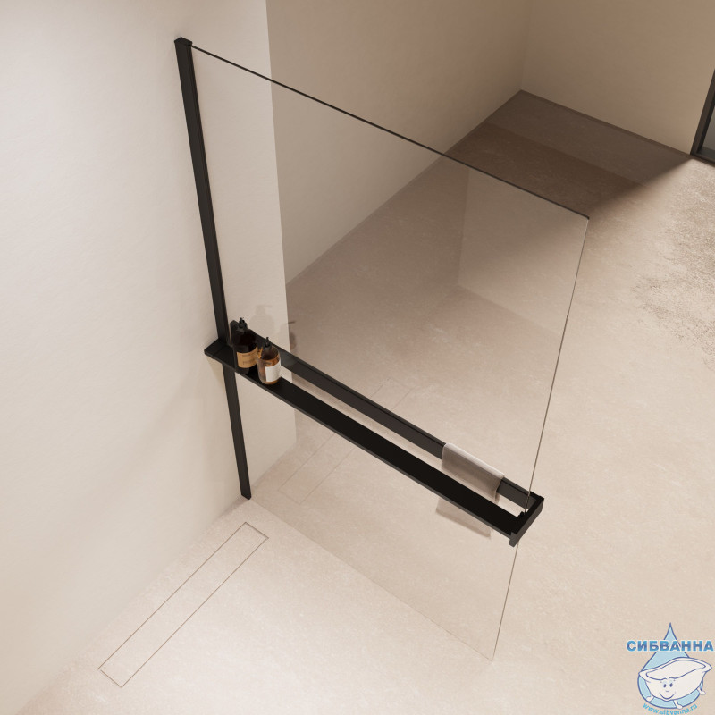 Серия: Walk-In Материал: алюминий Высота, мм: 2000 Толщина стекла: 8мм Душевая перегородка с полкой и полотенцедержателем Максимальная длина держателя кронштейна – 1200мм Длина полки с полотенцедержателем – 1400мм