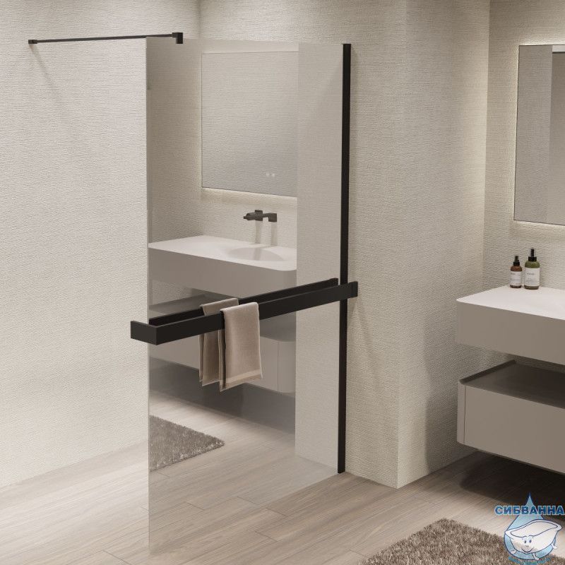 Серия: Walk-In Материал: алюминий Высота, мм: 2000 Толщина стекла: 8мм Душевая перегородка с полкой и полотенцедержателем Максимальная длина держателя кронштейна – 1200мм Длина полки с полотенцедержателем – 1400мм