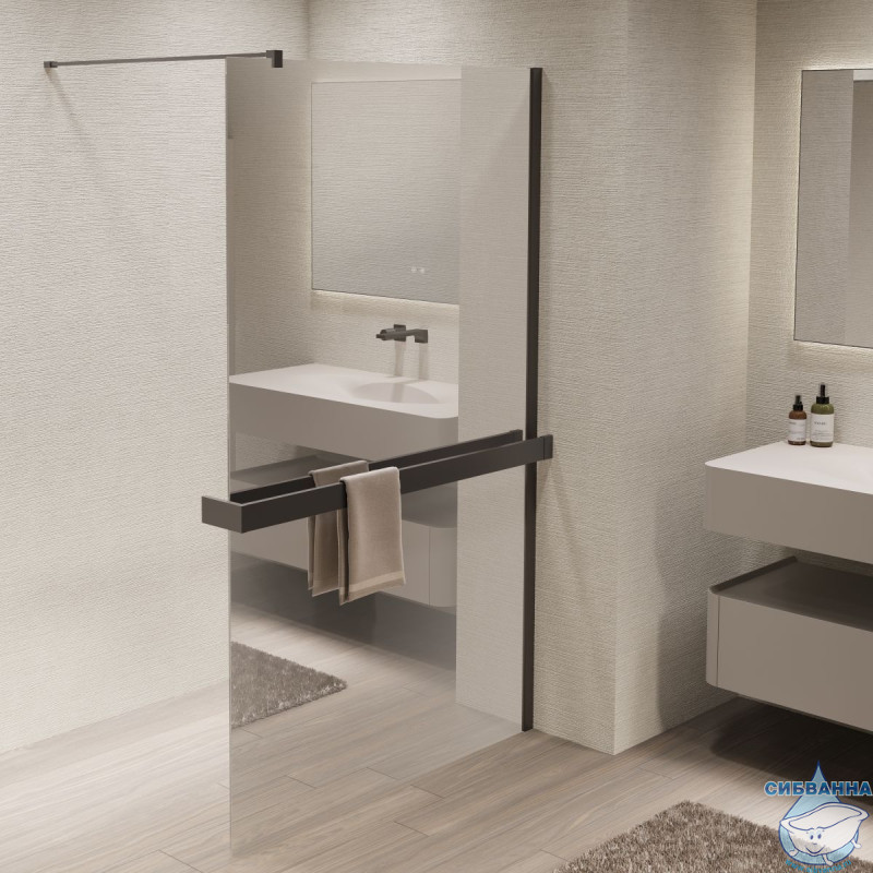 Серия: Walk-In Материал: алюминий Высота, мм: 2000 Толщина стекла: 8мм Душевая перегородка с полкой и полотенцедержателем Максимальная длина держателя кронштейна – 1200мм Длина полки с полотенцедержателем – 1400мм