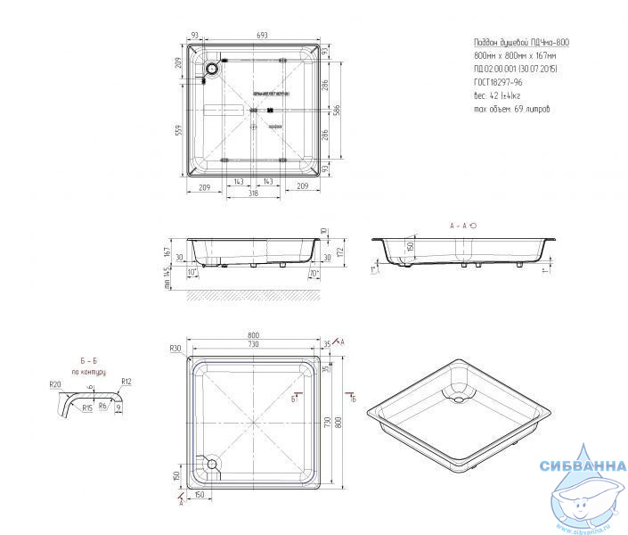 Прочный корпус душевого поддона не прогибается, рассчитан на допустимую нагрузку 150 кг.
