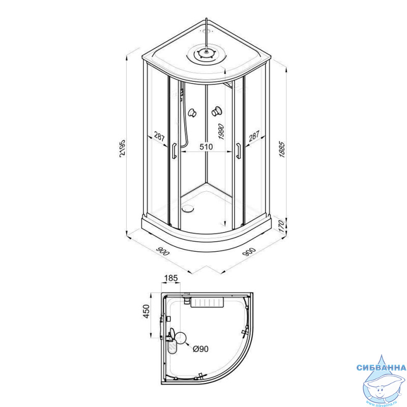 • Размер кабины 90x90