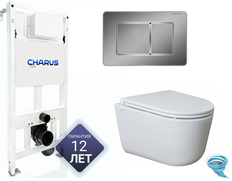 Инсталляция для подвесного унитаза CHARUS CC.300.80.01 Инсталляция с бачком для подвесного унитаза CHARUS TM — универсальная система от опытного российского производителя. По качеству и функциональности продукция ни в чем не уступает европейским брендам. Срок эксплуатации товара — более 25 лет. Гарантия на конструкцию действует 12 лет с момента покупки. Гарантия на поставку запасных частей — 15 лет. В течение этого времени каждый покупатель может обратиться за бесплатным гарантийным обслуживанием.Инсталляция совместима с унитазами любых брендов и кнопками смыва брендов CHARUS и Geberit Sigma. Большой ревизионный люк упрощает монтаж внутренних элементов, а лазерная отметка уровня 1 м до чистого пола гарантирует корректную установку конструкции. Двухкнопочная система настройки слива позволяет с легкостью управлять объемом сливаемой воды и экономить до 8 литров в день. Смывной бачок скрытого монтажа обеспечивает максимально тихий слив, а значит, инсталляция практически бесшумна. Контроль качества продукции осуществляется на всех стадиях производства: специалисты Чарус тщательно проверяют каждую партию.Вес конструкции без упаковки — 14.3 кг. Материал — сталь и пластик, нижнее основание рамного каркаса оцинковано. В местах крепления керамики толщина изделия увеличена до 3 мм. Благодаря повышенной прочности каждого элемента инсталляция выдерживает до 400 кг.