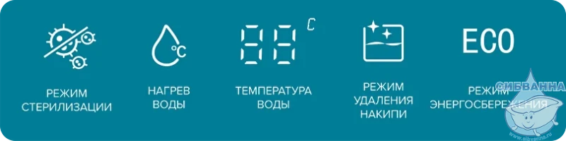 включается при приближении пользователя и отображает температуру воду и активные процессы.