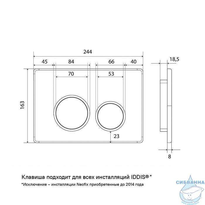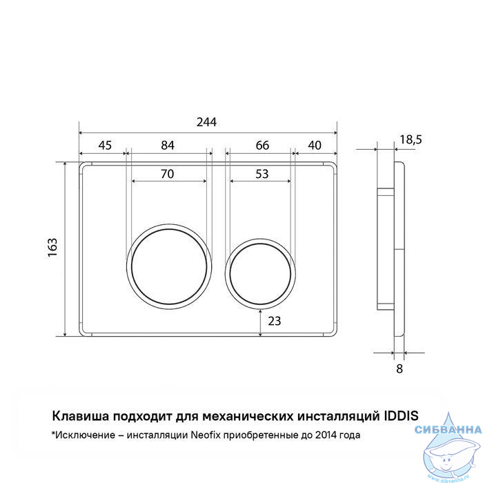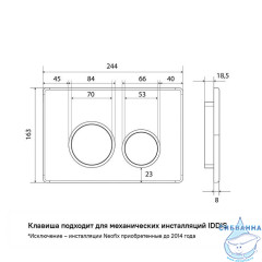 Хромированная клавиша IDDIS® Unifix составит базовый комплект с подвесной сантехникой – подходит ко всем инсталляциям IDDIS®, кроме инсталляции Neofix в модификации, продававшейся до 2014 года (см. на фото). Глянцевый контур круглых кнопок выступает ярким акцентом, превращая функциональный продукт в стильный аксессуар. Плоская и эстетичная клавиша легко монтируется и снимается для удобного доступа к крану открытия-закрытия воды и обслуживания арматуры. Модель представлена в нескольких цветовых решениях.