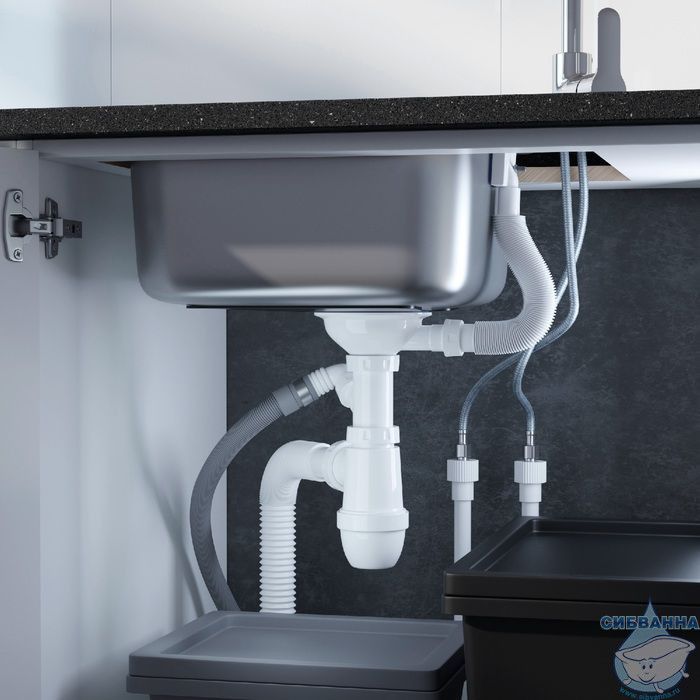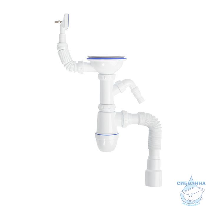 • Сифон с отдельным отводом для стиральной/посудомоечной машины с обратным клапаном и гофрированными отводами для удобства подключения.