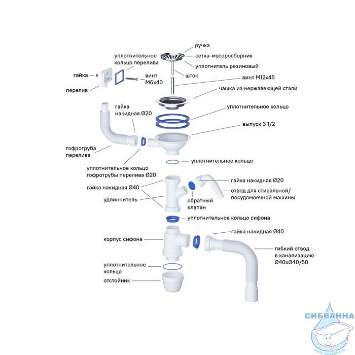• Есть все для монтажа: выпуск, сифон, уплотнительная лента, крепеж.
