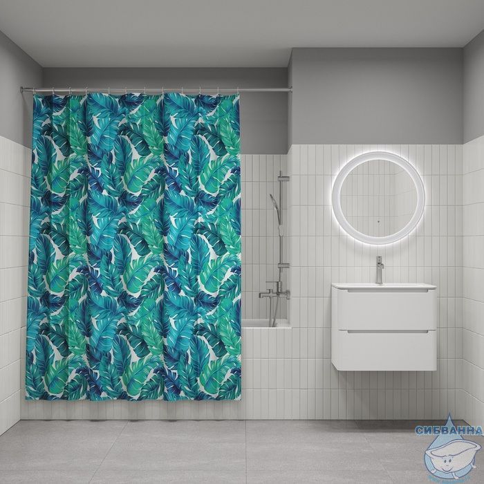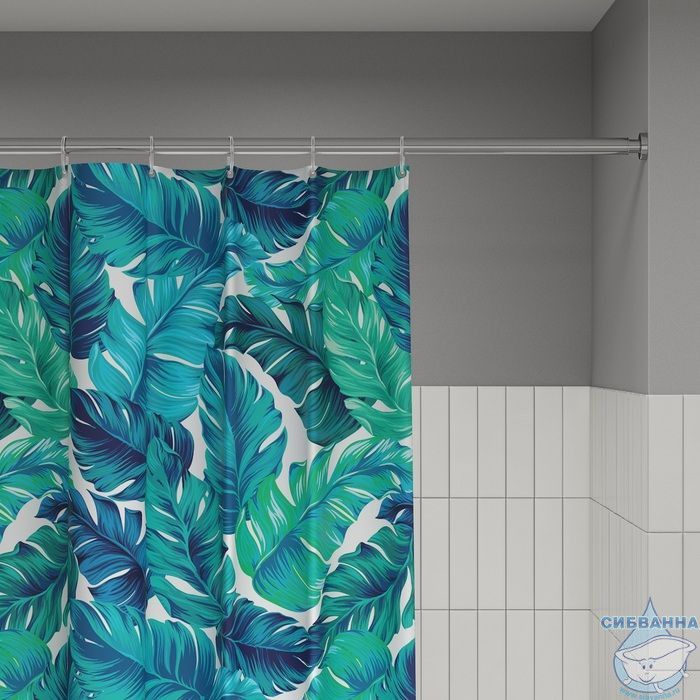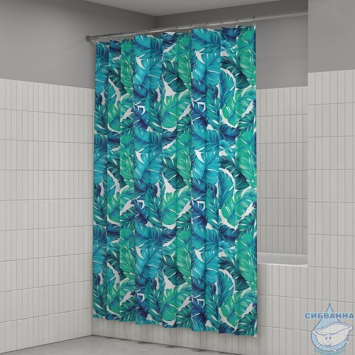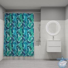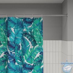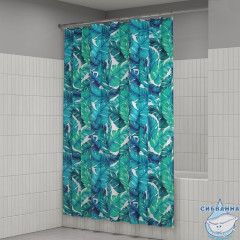 Текстильная штора для ванной с ярким сине-зеленым принтом из тропических листьев.