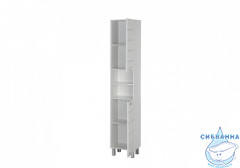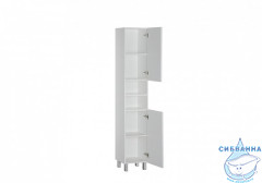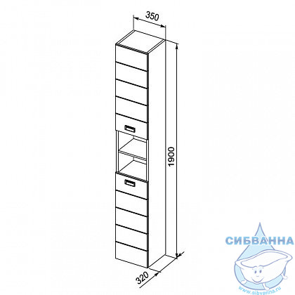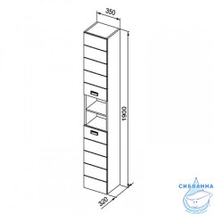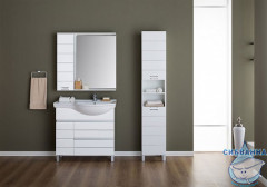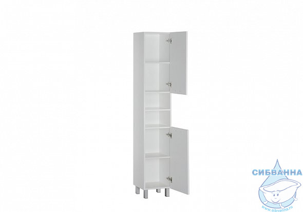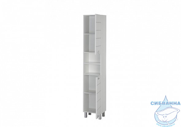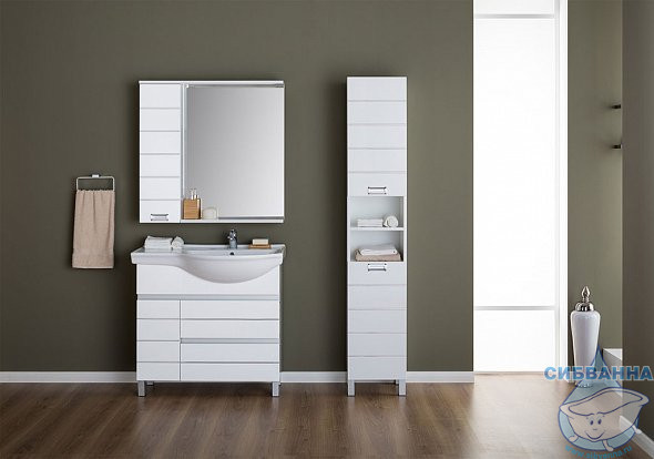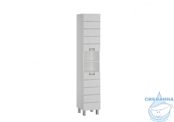 Стильный пенал для набора мебели ванной комнаты в стиле «модерн». Оригинальные детали – ручки-прорези и ритм, создаваемый горизонтальными линиями отделки подчеркивают неординарность, экзотичность гарнитура. Функциональная часть представлена двумя вместительными отделениями с распашными дверцами и открытыми полочками, где можно расставить интерьерные аксессуары.