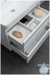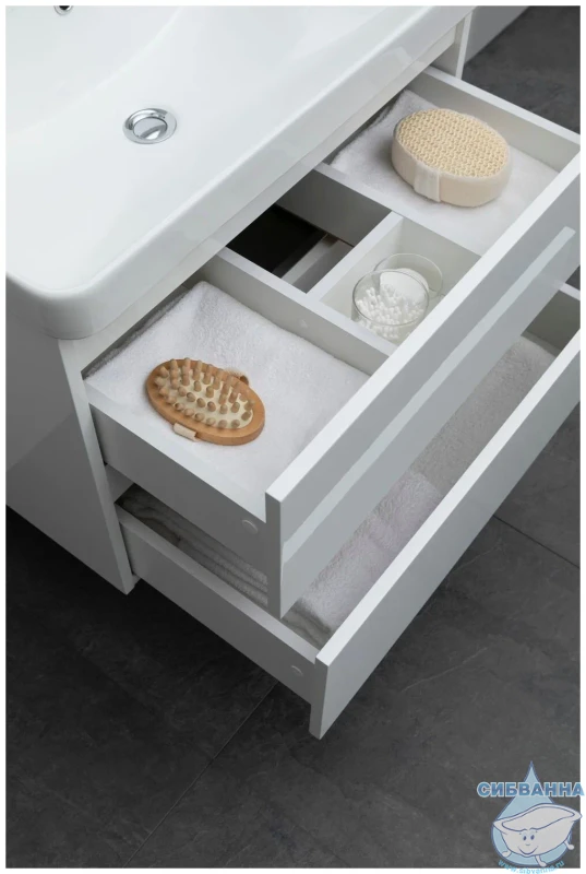 Особенностью тумбы является наличие двух выдвижных ящиков с доводчиками, которые обеспечивают плавное и бесшумное закрывание. Это не только удобно, но и продлевает срок службы мебели, предотвращая износ и повреждение ящиков.