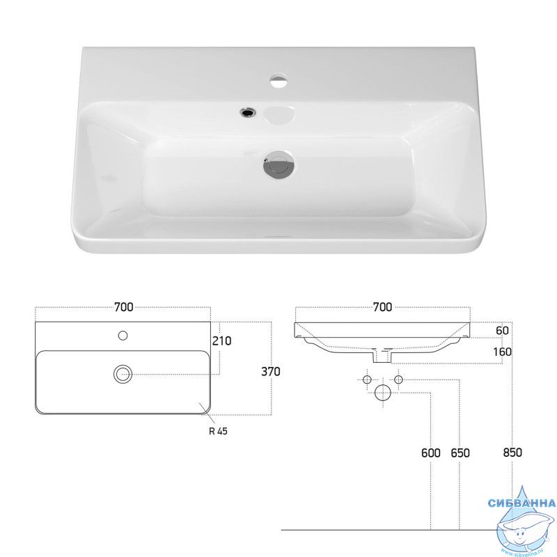 - Размер раковины, мм (ш/г/в): 700x370x160