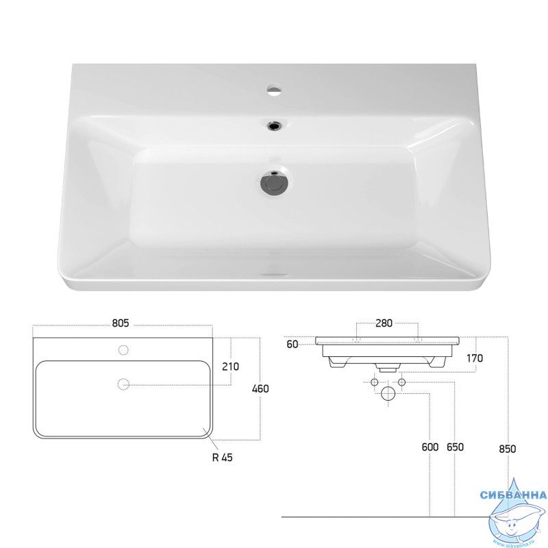 - Размер раковины, мм (ш/г/в): 805x460x170