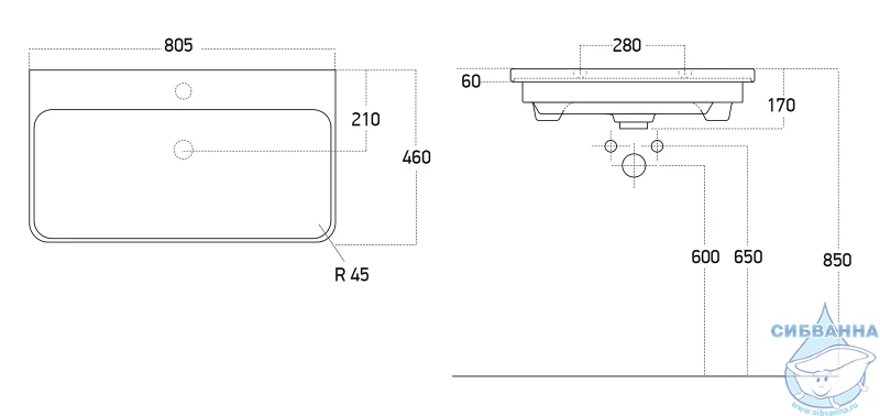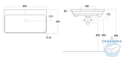 - Размер раковины, мм (ш/г/в): 805x460x170