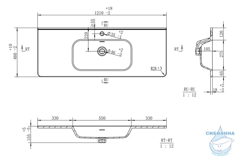 - Размер раковины, мм (ш/г/в): 1210x460x155