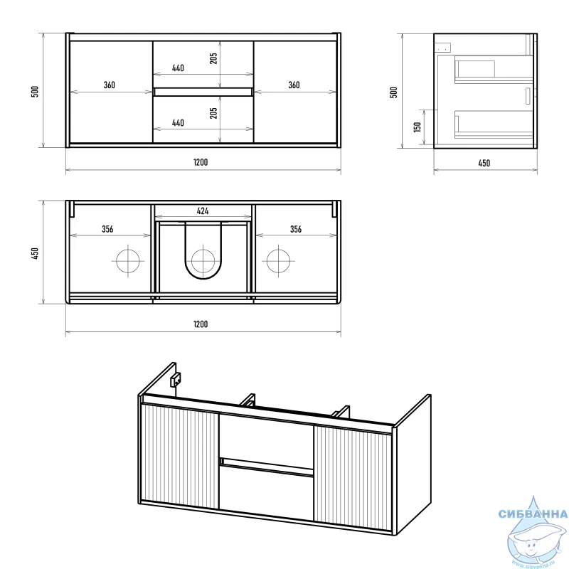 - Размер раковины, мм (ш/г/в): 1210x460x155