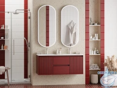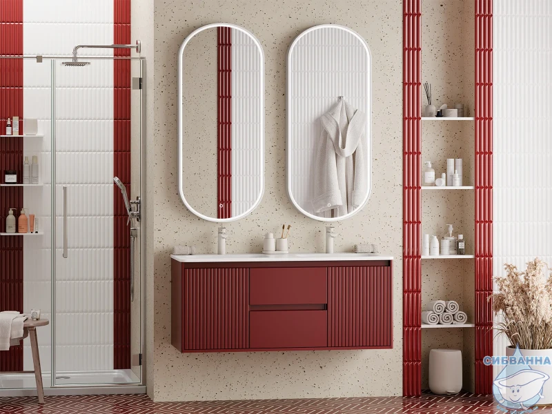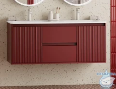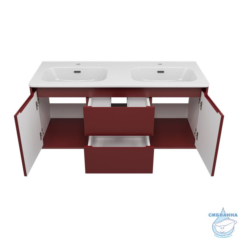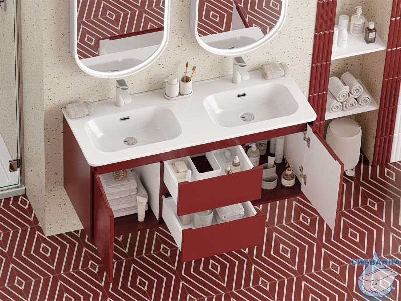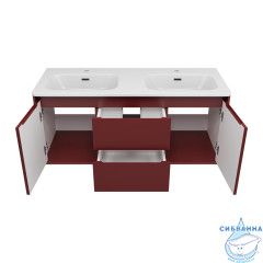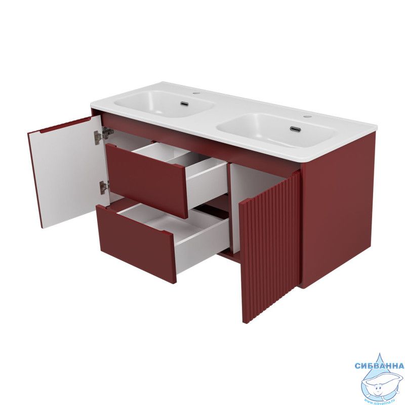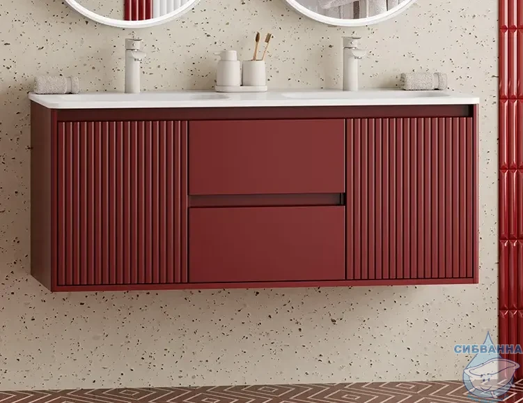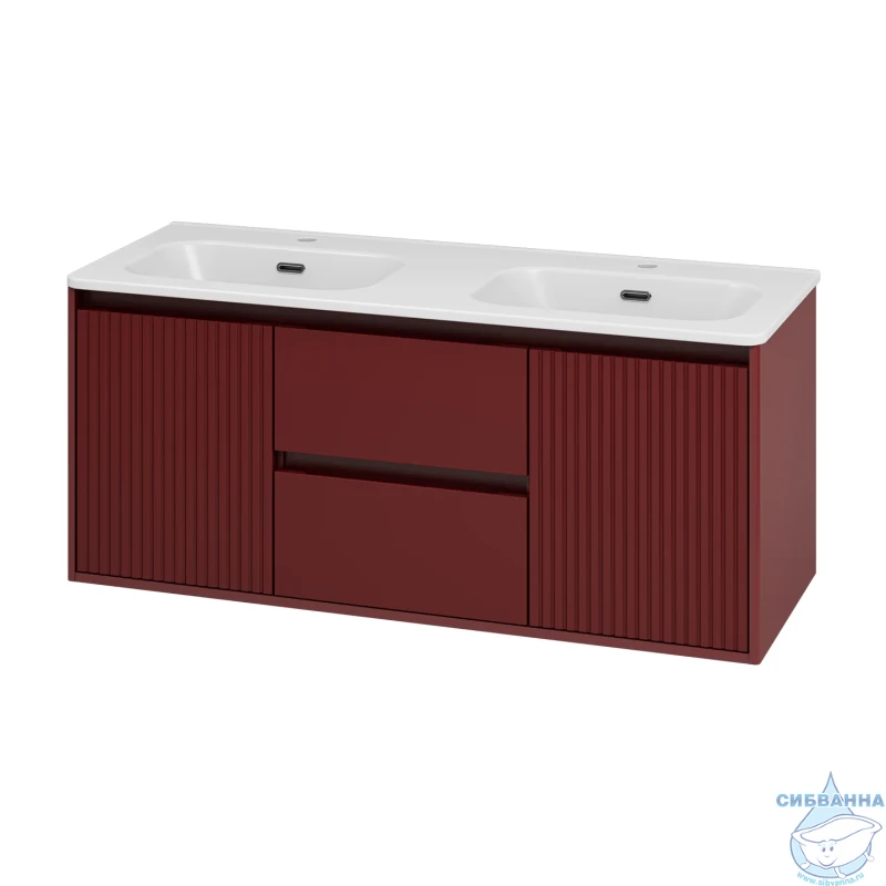 Подвесная тумба Brevita Wine 120 (бордовая) с раковиной Brevita Onda 120 с двумя чашами