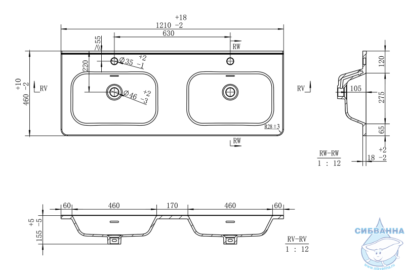 - Размер раковины, мм (ш/г/в): 1210x460x155