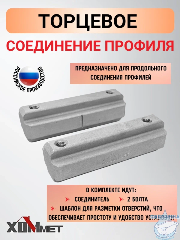 Торцевое соединение профиля Хоммет (ХОММЕТ9010009) предназначено для продольного соединения профилей. В комплекте идут соединитель, 2 болта и шаблон для разметки отверстий, что обеспечивает простоту и удобство установки.