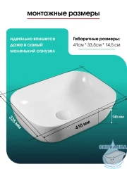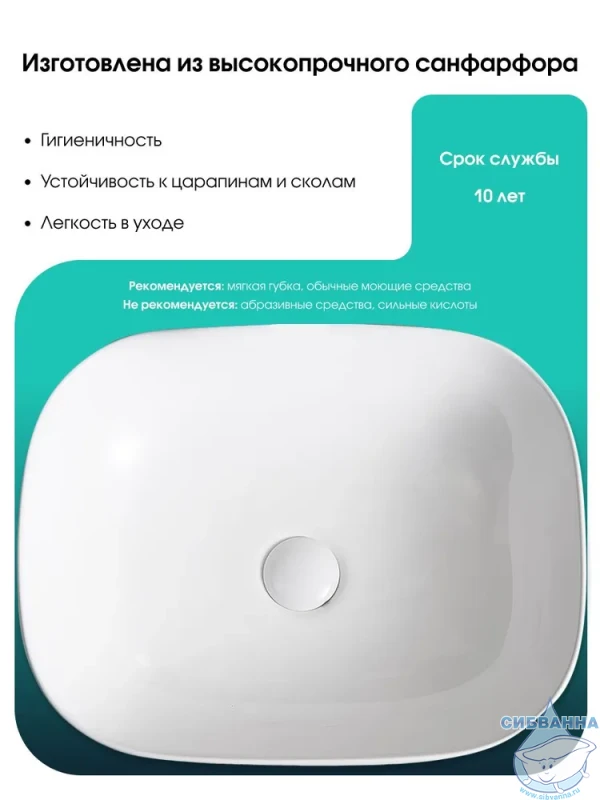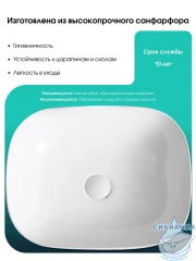Calypso CS2188 – это накладная раковина, что подразумевает установку ее на специальную столешницу и использование отдельностоящего или встраиваемого смесителя с высоким изливом. Ширины 41 см и глубины 33 см достаточно для комфортного использования ее взрослыми и детьми. Форма в виде прямоугольника со скругленными углами эстетически приятна и не травмоопасна, а сантехнический фарфор, из которого изготовлена раковина, отличается прочностью и долговечностью. На изделие дается гарантия 10 лет.