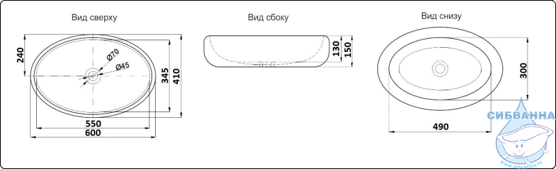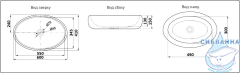 Габариты (шгв) 600X410X150 мм Фаянсовая Накладная Устанавливается на столешницу Без готовых отверстий под смеситель Диаметр слива: 45 мм