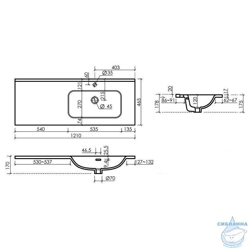 Раковина накладная мебельная Element, , с отверстием под смеситель, 1210x465x180 мм, цвет белый, арт. CN7006R