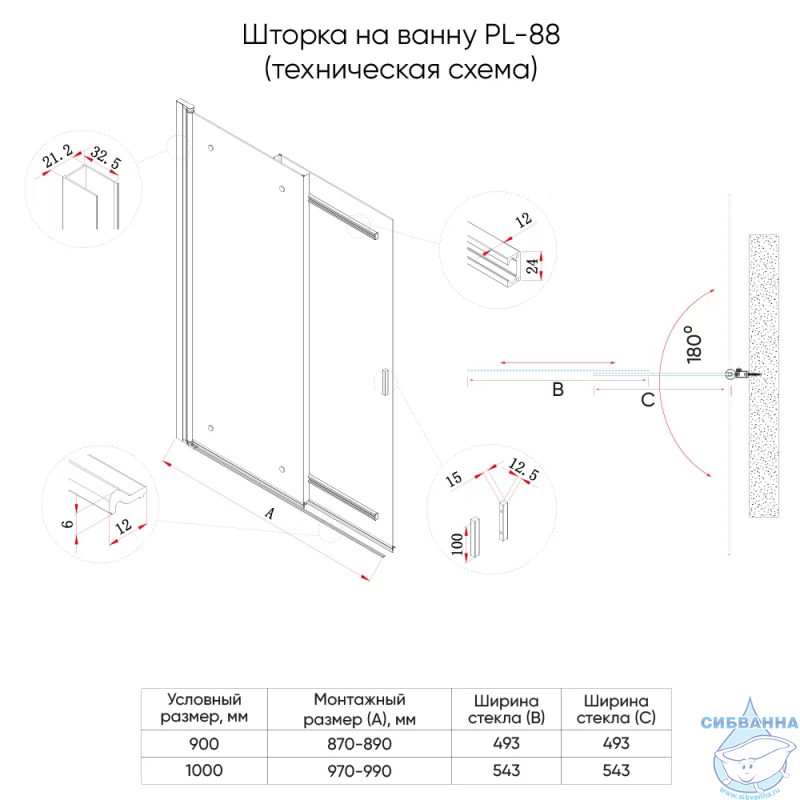 Шторка на ванну раздвижная/распашная. Стекло закалённое безопасное 4 мм. Профиль анодированный алюминий.