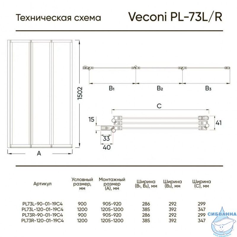 Шторка для ванны Veconi Palau 120x150 профиль черный, стекло прозрачное PL73BL-120-01-19C4