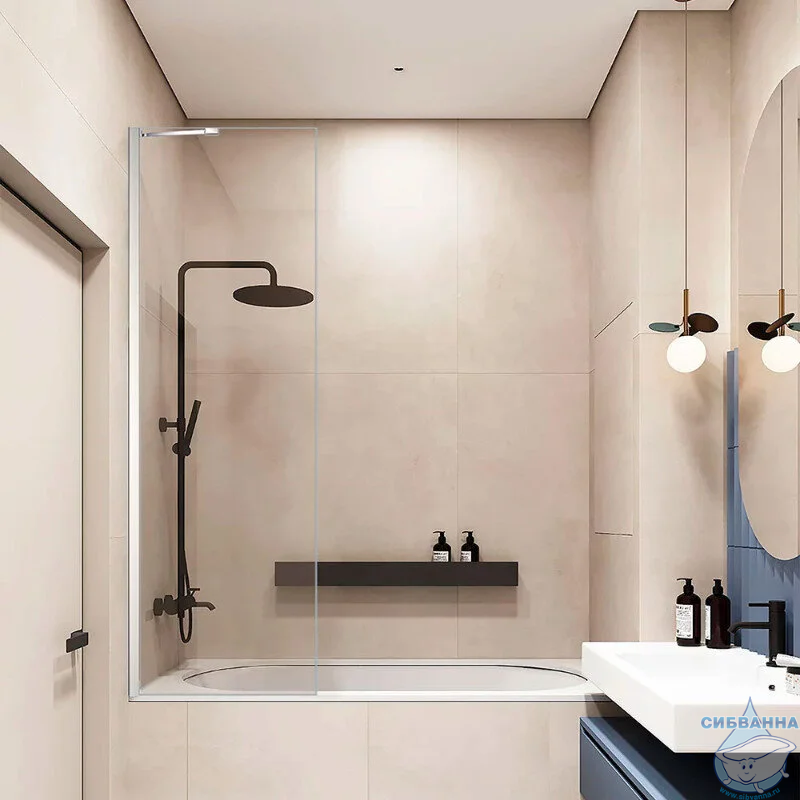 Душевая шторка на ванну фиксированная. Свободный вход. Стекло закаленное: прозрачное. Толщина стекла: 6 мм. Ориентация: универсальная. Материал профиля: анодированный алюминий. Форма: прямоугольная.