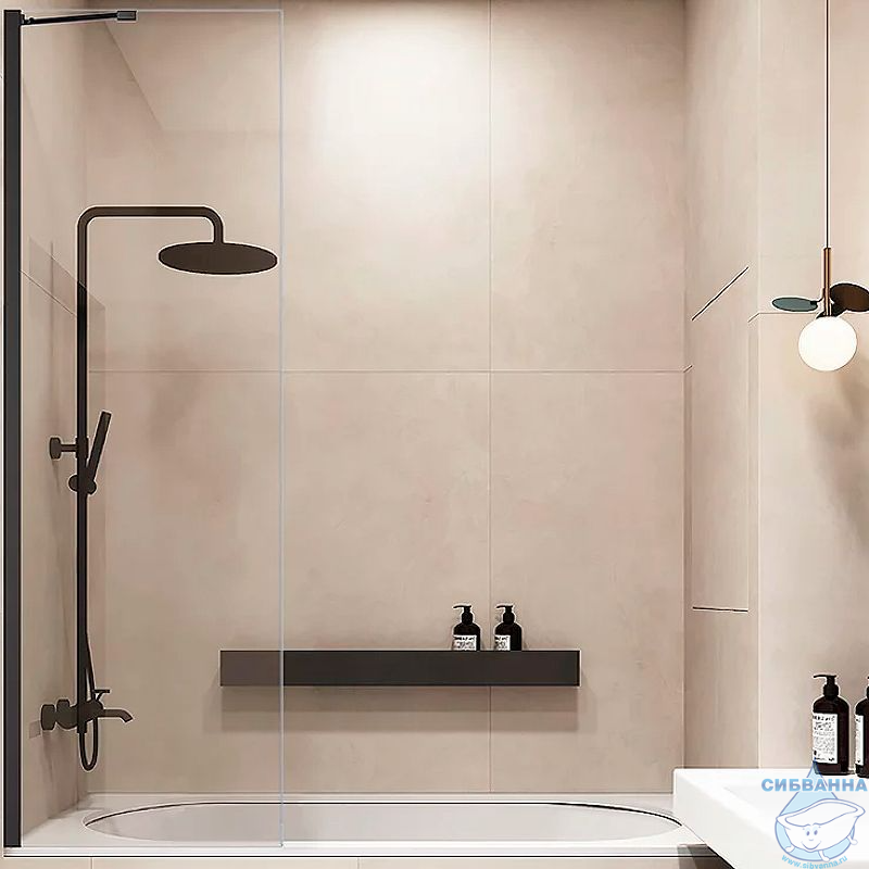 Душевая шторка на ванну фиксированная. Свободный вход. Стекло закаленное: прозрачное. Толщина стекла: 6 мм. Ориентация: универсальная. Материал профиля: анодированный алюминий. Форма: прямоугольная.