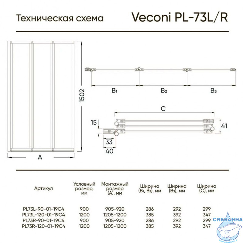 Шторка для ванны Veconi Palau 90x150 профиль черный, стекло прозрачное PL73BR-90-01-19C4