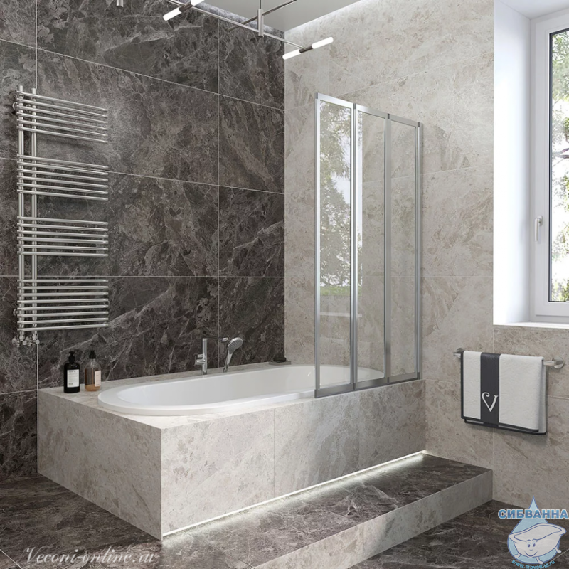 Оригинальная складная шторка для ванной с полотном из безопасного закаленного стекла. Двустороннее покрытие Easy Clean обеспечивает защиту поверхности от разводов, сокращает появление известкового налета и загрязнений. Анодированное покрытие профиля защищает его от коррозии и механических повреждений.