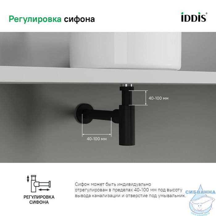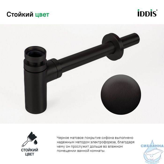 • Черное матовое покрытие сифона IDDIS® выполнено надежным методом электрофореза, благодаря чему аксессуар прослужит дольше во влажном помещении ванной комнаты. На протяжении многих лет он будет выглядеть как новый.