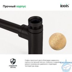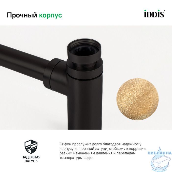 • Сифон IDDIS® прослужит долго благодаря надежному корпусу из прочной латуни, стойкому к коррозии, резким изменениям давления и перепадам температуры воды.