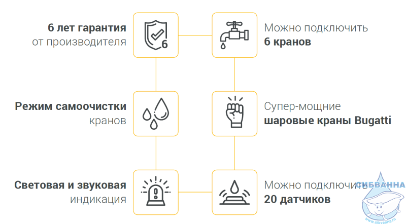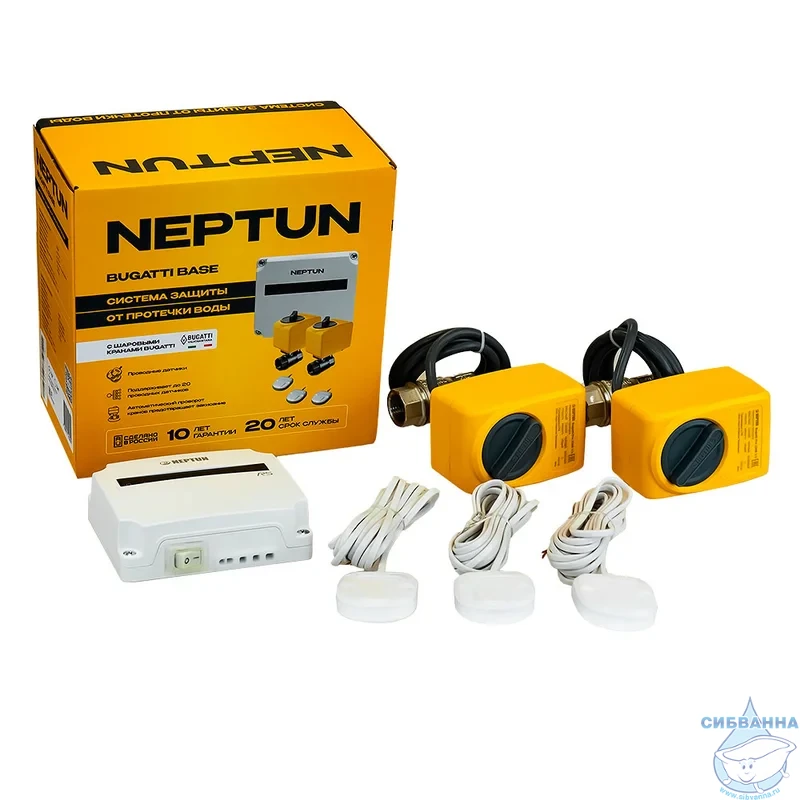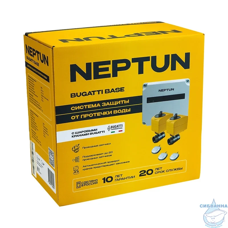 Neptun Bugatti Base - это лучшее соотношение цены и качества. Модуль управления Neptun Base - простое, но при этом очень надежное устройство. Дополнительных функций не много, но если они Вам и не нужны, то это идеальное решение. Главное, что в комплекте идут зарекомендовавшие себя шаровые краны Neptun Bugatti, которые едут напрямую с завода в Италии. У электропривода большое усилие (ломает карандаши), которое никогда не будет лишним с учетом не очень качественной водоподготовки в России, в кране используются самые лучшие уплотнительные материалы (первичный фторопласт, который выдерживает даже серную кислоту) и конечно же - есть ручное аварийное открывание на случай, если не будет питания или электроника выйдет из строя.
