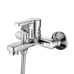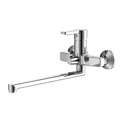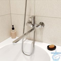 Смеситель для ванны с длинным изливом, однозахватный, латунь, увеличенное никель-хромовое покрытие, керамический дивертор, керамический картридж 35 мм Softap, пластиковый аэратор Neoperl со специальной сеткой для снижения шума, со встроенным ограничителем потока, длина излива 350 мм.