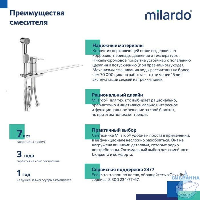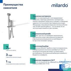 • Гарантия на смеситель Milardo® – 7 лет, на картридж – 3 года, на душевые аксессуары – 1 год.