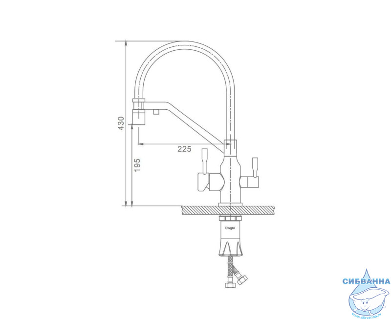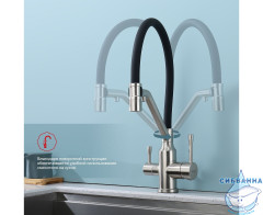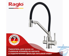 Смеситель для кухни Raglo R81.62. Характеристики: Материал: латунь. Управление: однорычажное. Механизм: керамический картридж. Излив: съемный на магните, поворотный, гибкий, с каналом для питьевой воды. Аэратор. Стандарт подводки: G 1/2. Тип подводки: гибкая. Отверстия для монтажа: 1. Монтаж: на мойку / на столешницу. В комплекте поставки: Смеситель для кухни. Гибкая подводка. Комплект креплений.