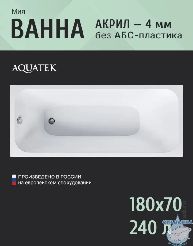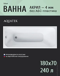 Ванна Aquatek Мия серии EcoFriendly изготовлена из 100% акрилового листа толщиной 4 мм. Дно ванны дополнительно усилено толстым листом ДСП. Конструкция является надежной и долговечной. Для монтажа ванн серии EcoFriendly можно использовать, по своему выбору, универсальную опору или сборно-разборный алюминиевый каркас-шпильку. Оба варианта монтажа являются одинаково-прочными конструкциямии рассчитаны на все предполагаемые нагрузки на ванну.