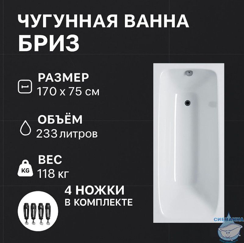 Чугунная ванна Универсал Бриз 170х75 с ножками