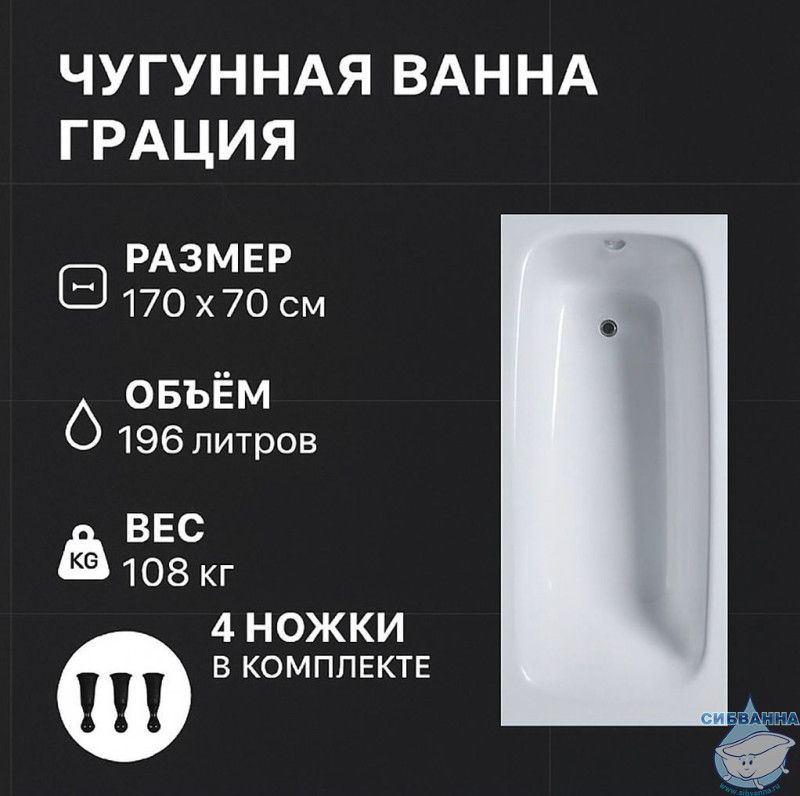 Чугунная ванна «Грация» - традиционная модель с гладкими скругленными бортами для любителей классики и минимализма.